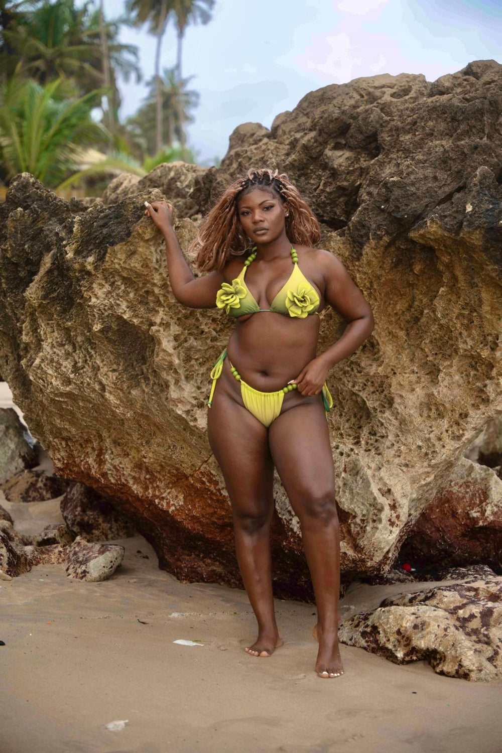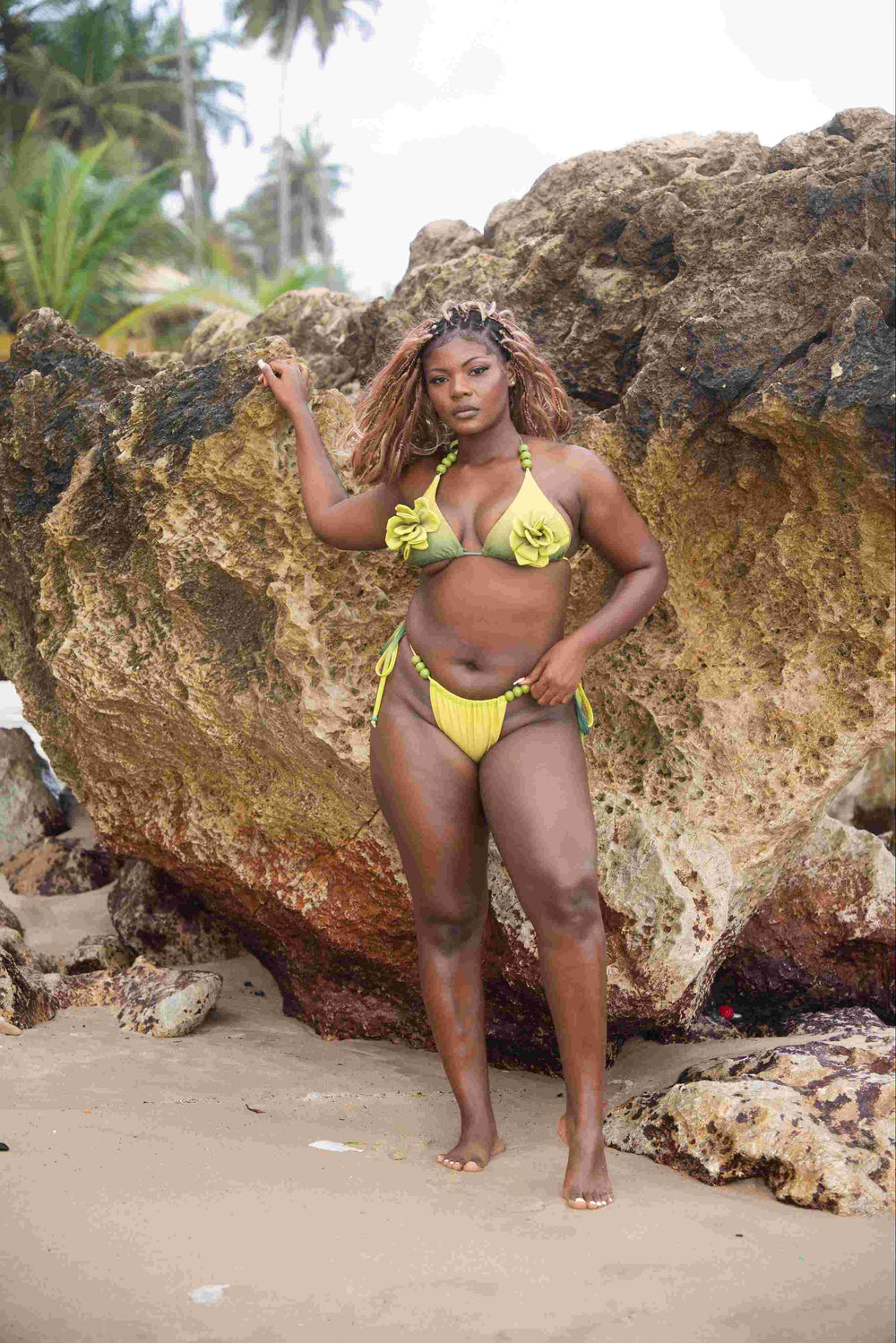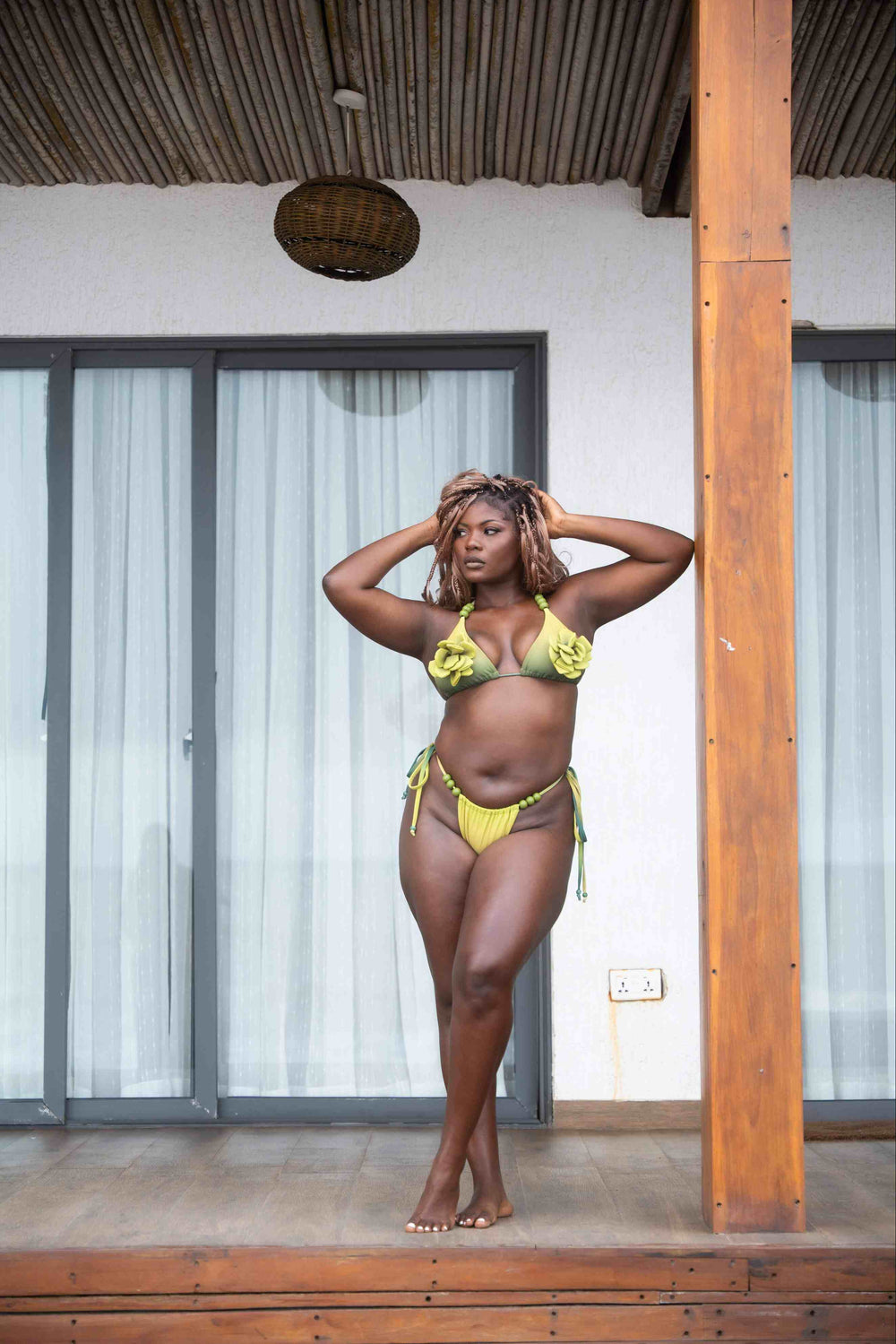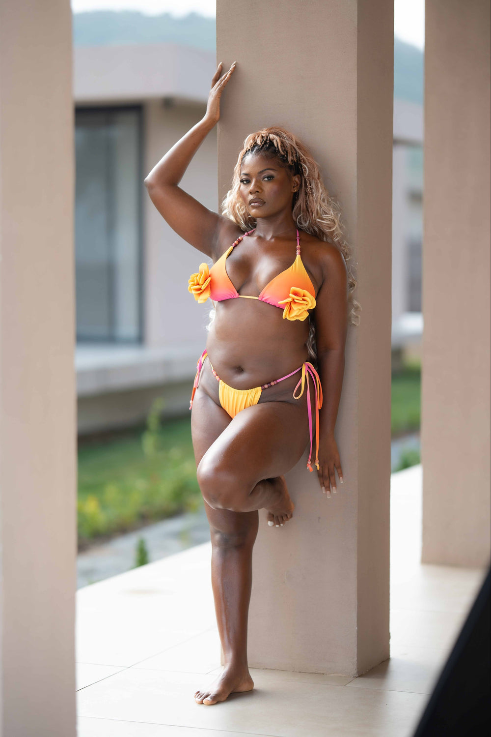 NANA Flower Bikini – The Ombre Kente print inspired by Ashanti Silk Hand-Woven Kente, Savannah 3D Hibiscus Flowers, Moringa Miracle Leaves and African beads, complete the one of a kind statement bikini.