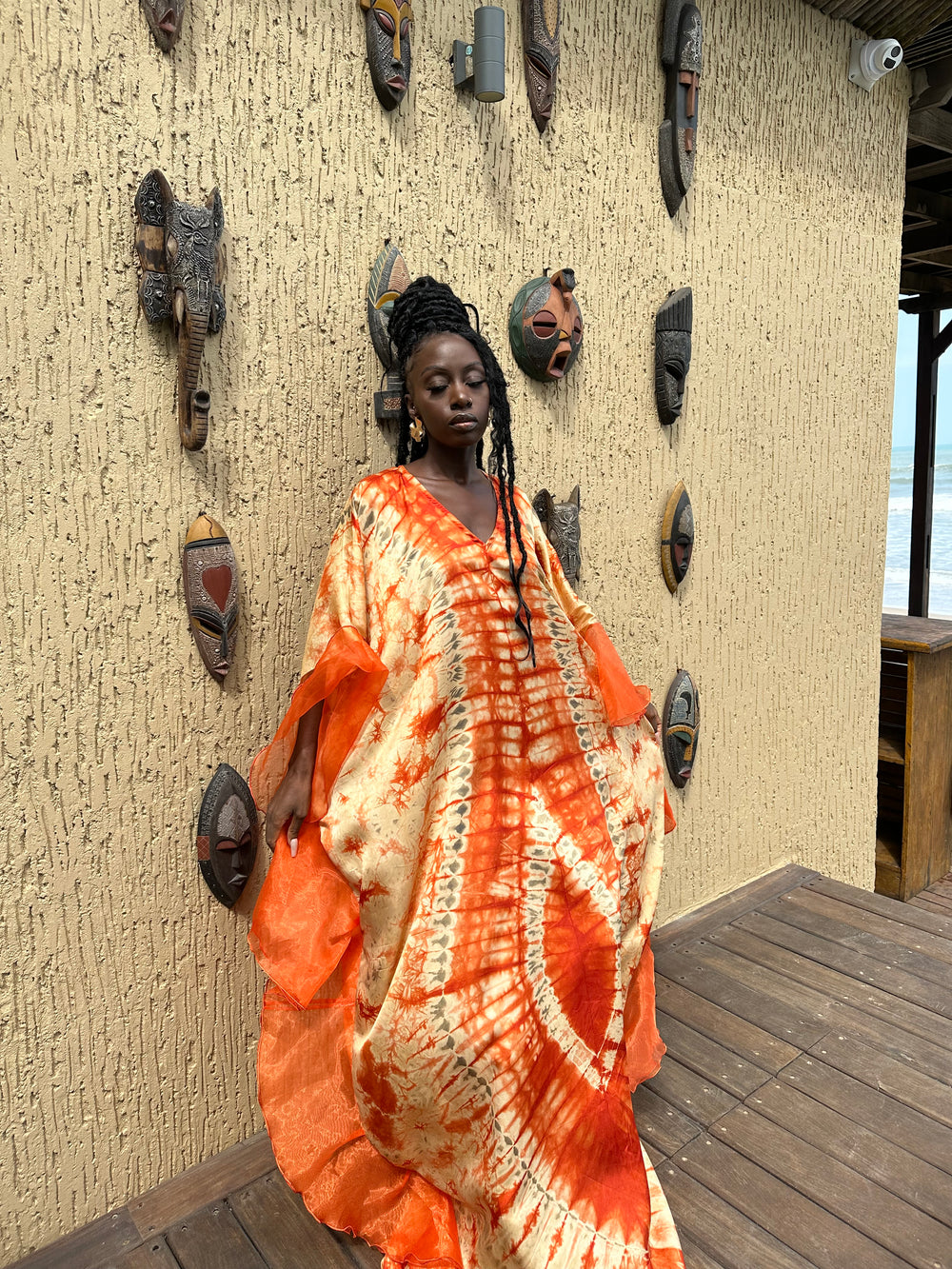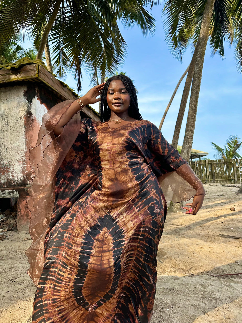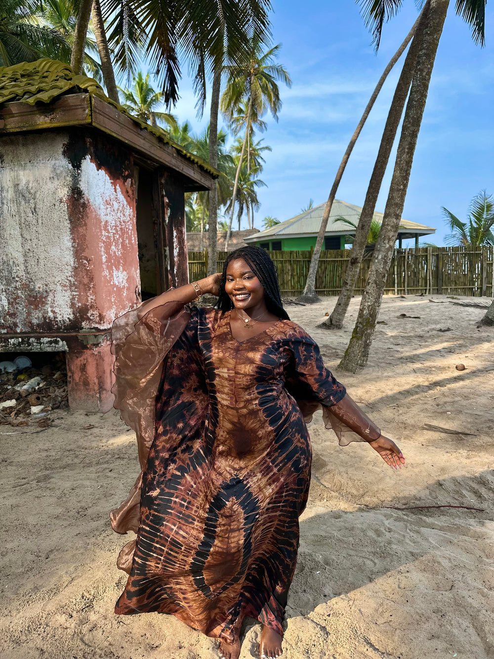 This Bou Bou/Kaftan features a unique and eye‑catching Adire design. The “Adire” (tie & dye) print is crafted in Ghana by artisans who tie or pleat the fabric before dyeing. Adire traditionally uses cotton fabric and indigo dye from the indigo plant, so each motif is truly one‑of‑a‑kind.
