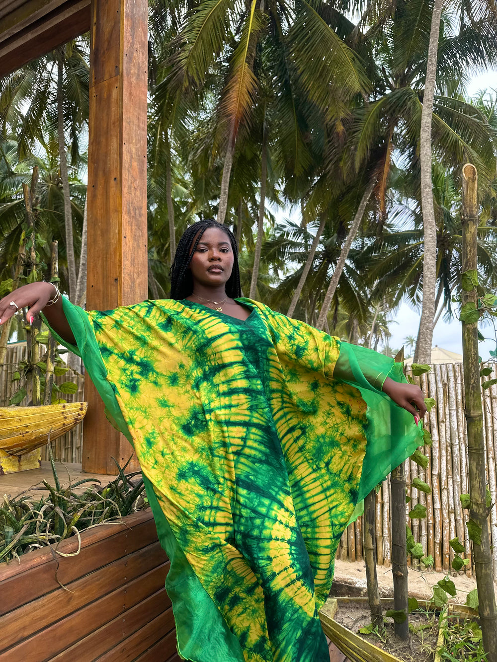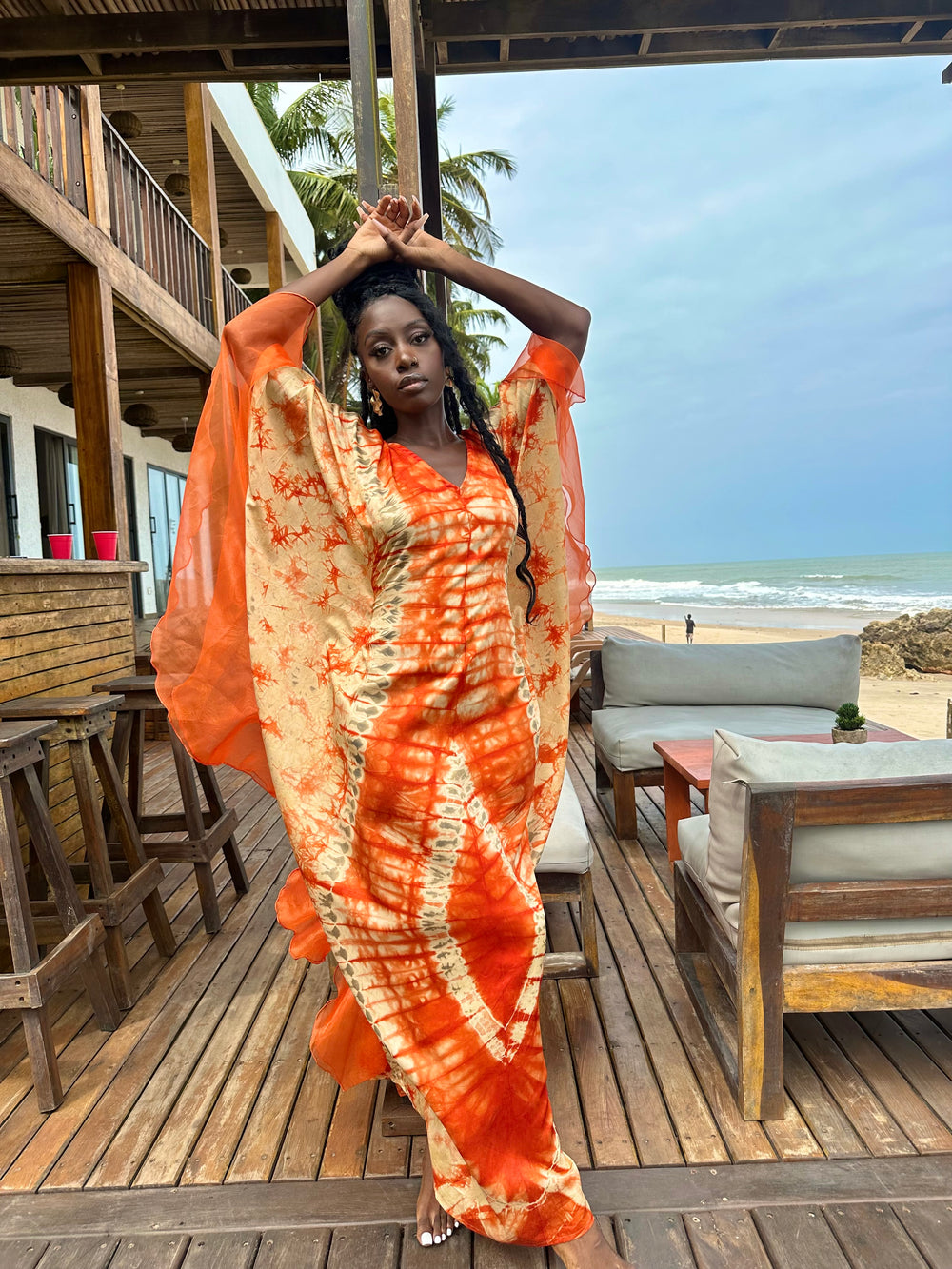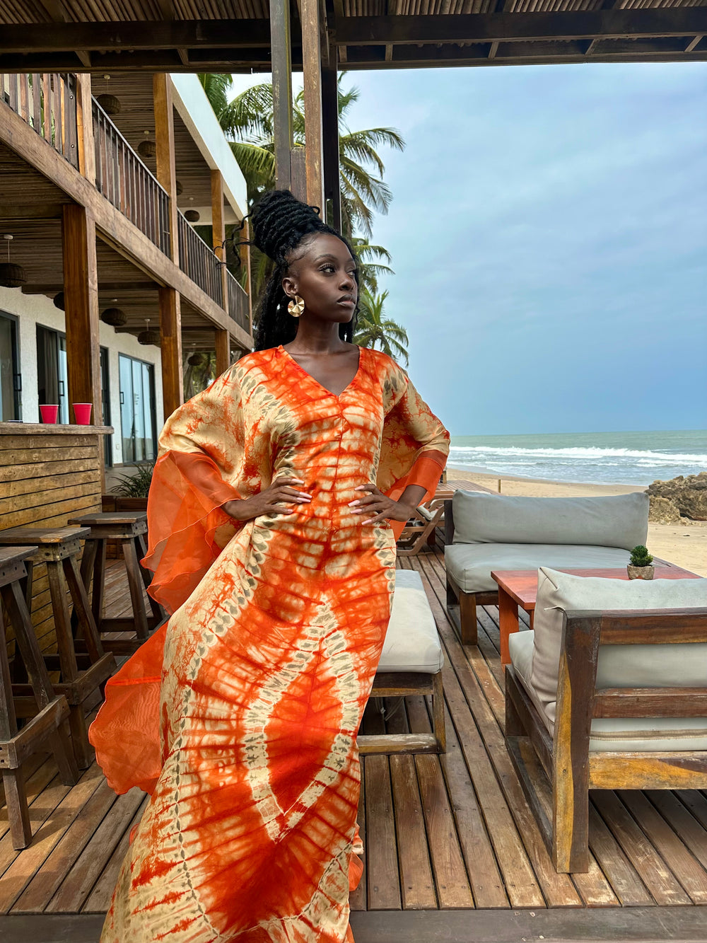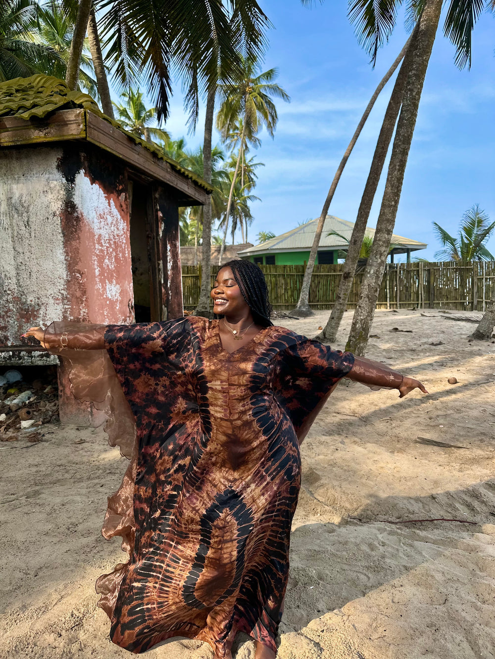 This Bou Bou/Kaftan features a unique and eye‑catching Adire design. The “Adire” (tie & dye) print is crafted in Ghana by artisans who tie or pleat the fabric before dyeing. Adire traditionally uses cotton fabric and indigo dye from the indigo plant, so each motif is truly one‑of‑a‑kind.