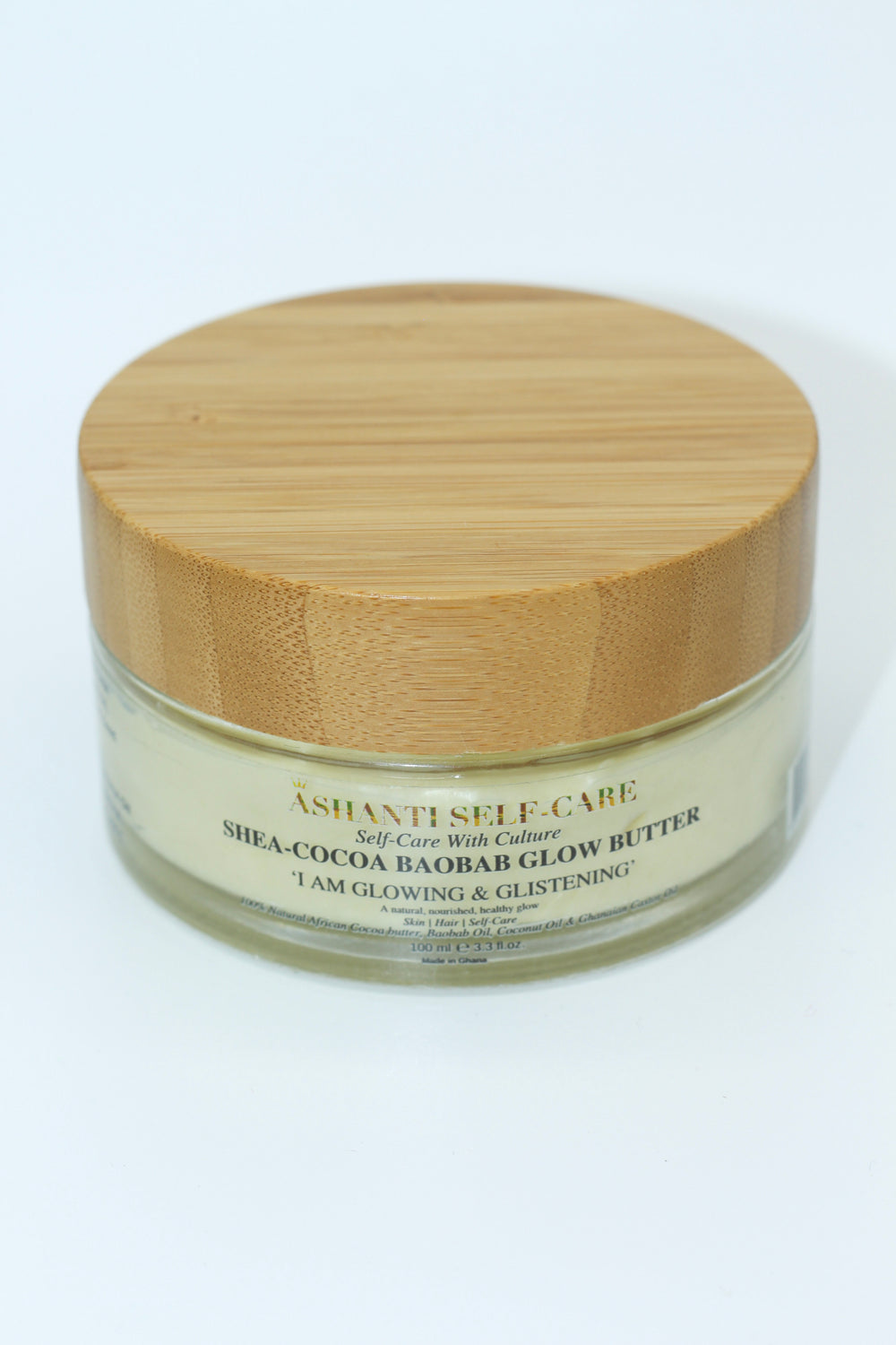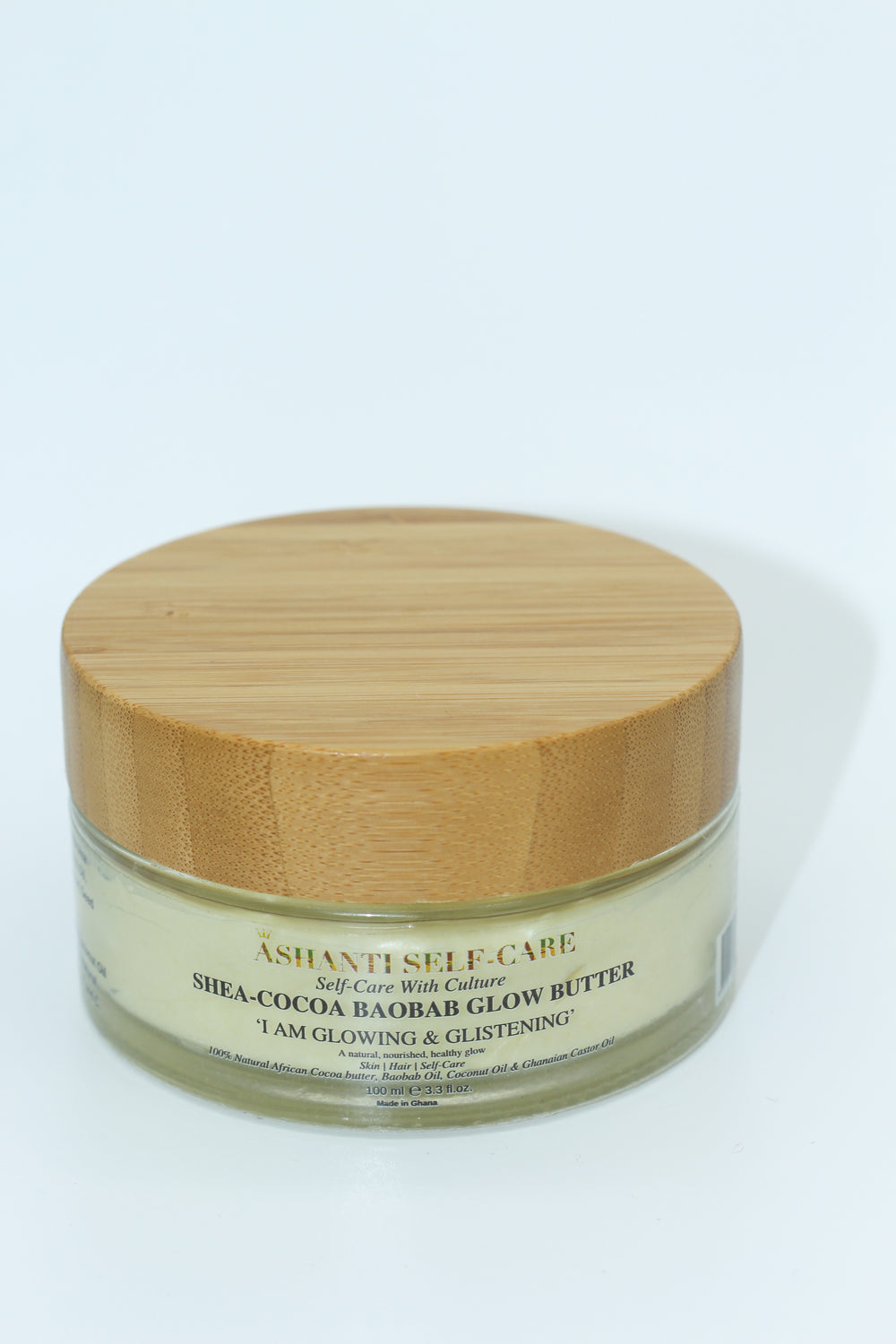 2. Shea-Cocoa Baobab Glow Butter Ingredients: Adansonia Digitata (Baobab Seed Oil)Butyrospermum Parkii (Shea Butter), Theobroma Cacao (Cocoa) Seed Butter, Adansonia Digitata (Baobab) Oil, Cocos nucifera (Coconut) Oil, Ricinus communis (Castor) Seed Oil (Ghanaian Castor Oil)